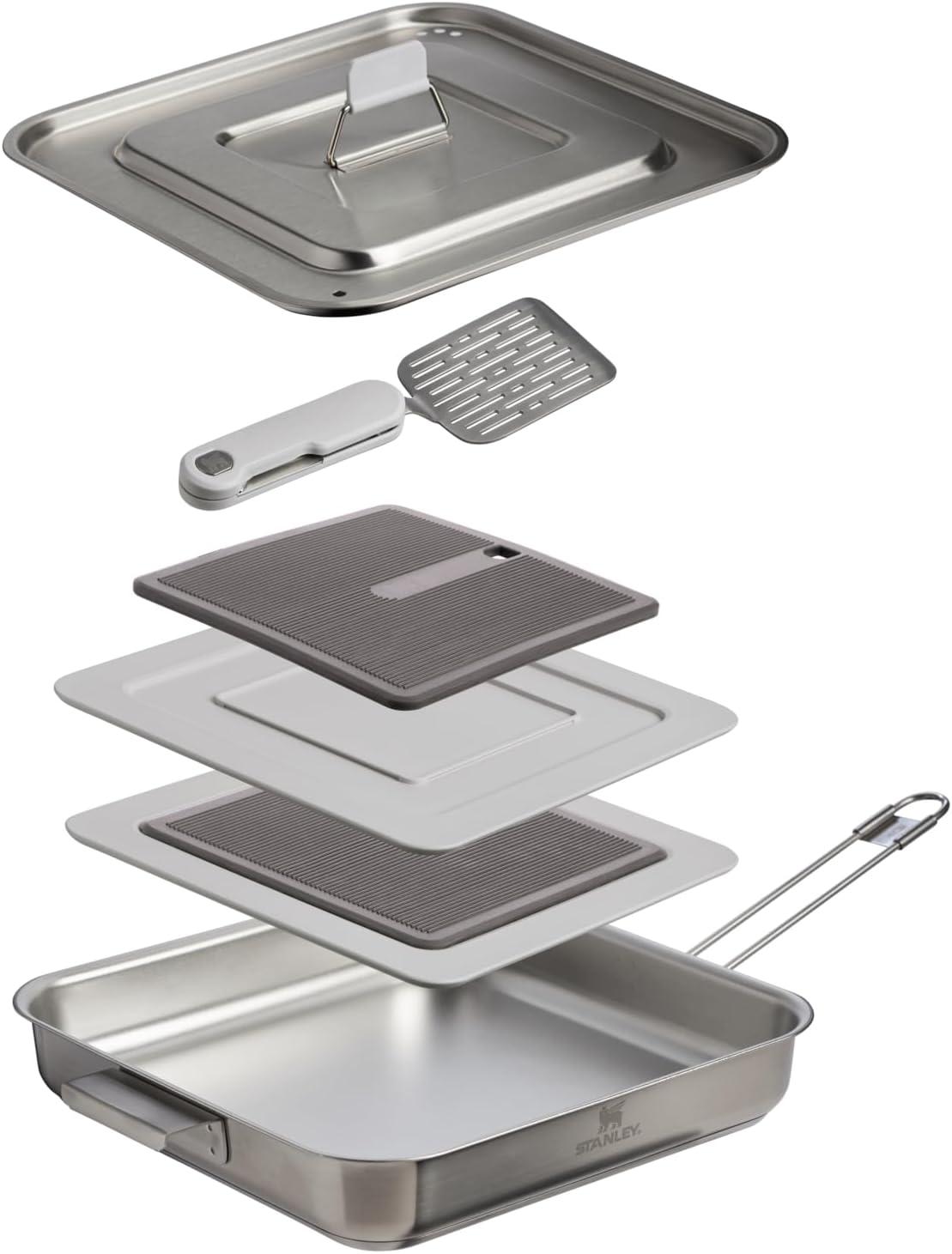 Stanley Wildfare Pro 5-Piece Stainless Steel Square Pan Cook Set | 10 in Fry Pan with Fold & Lock Handle | Cutting Board and Spatula | Camping Essentials for Your Camp Kitchen | BPA-Free