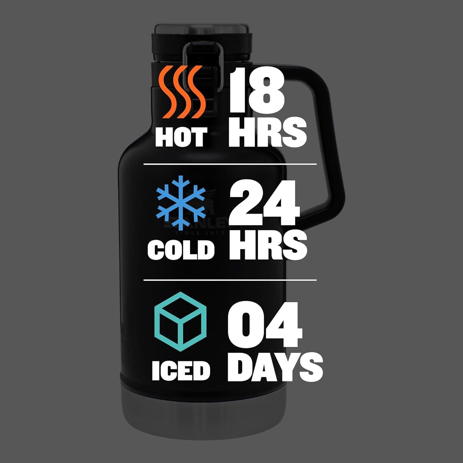 FRESH, COLD & CARBONATED: To keep your beer tasty, fizzy, and cold for up to 24 hours, the Stanley Growler features double-wall insulation with a steel inner lid. This design is entirely plastic-free, ensuring your drink's taste remains unchanged. It also excels at keeping coffee, tea, or soup hot for up to 18 hours.