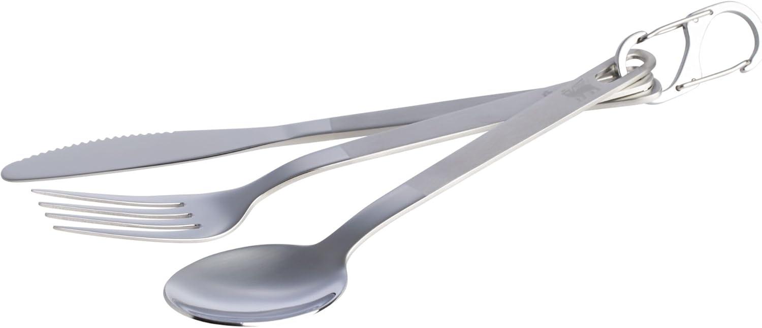 Packable and Comprehensive Set: This cookset includes two powder-coated stainless steel plates, two cutlery sets with carry clips, a nonslip cutting board with a removable trivet, and a stainless steel folding spatula. Everything nests together for compact storage and efficient use.